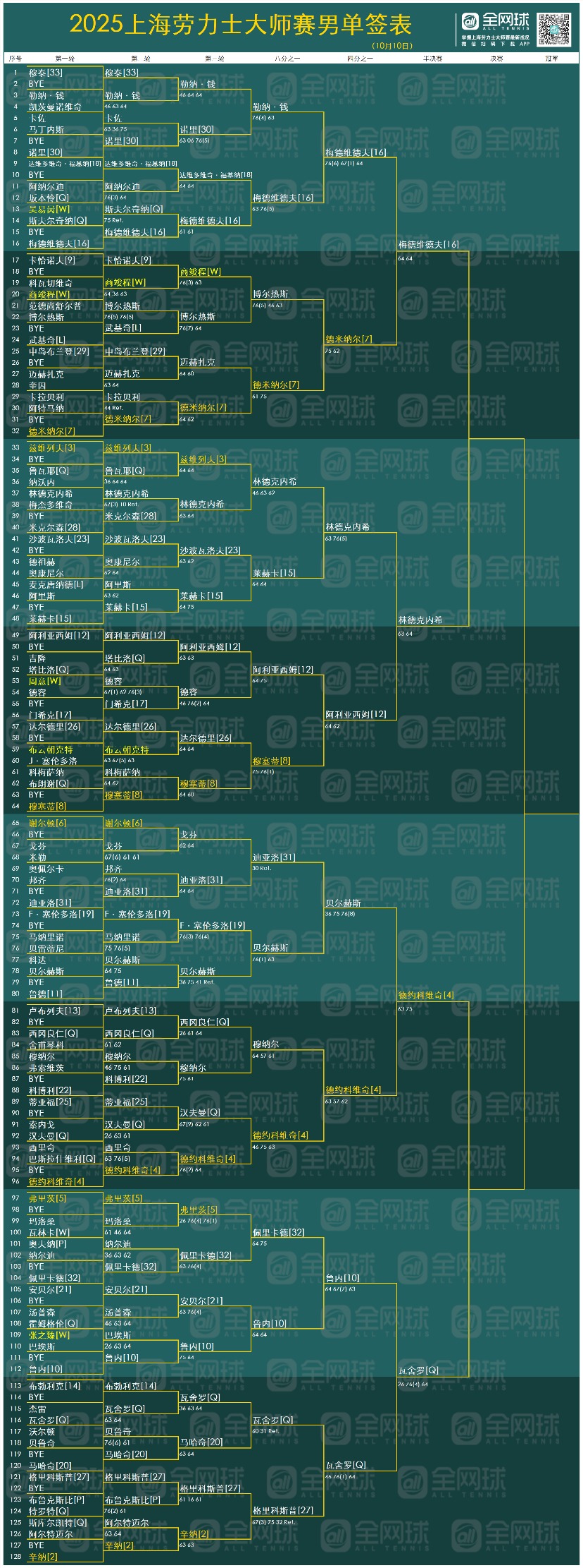 北京时间10月10日,2025上海劳力士大师赛展开第十比赛日的争夺,上半区两场男单1/4决赛结束。林德克内希淘汰阿利亚西姆、梅德维德夫战胜德米纳尔,本届赛事男单四强阵容产生。