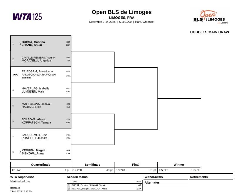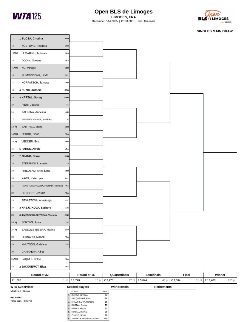 利摩日公开赛是一项室内硬地 WTA 125级别赛事,比赛将于12月8日至14日进行,共有32名单打选手和8对双打组合参赛。赛事总奖金达到100,000欧元,单打冠军可斩获125 个WTA排名积分和13,480欧元奖金。赛事最初创办于2007年,自2014年起升级为WTA 125级别赛事,同时也是年度收官之战,亚历山大洛娃、布克沙和格鲁比奇都是赛会前冠军。