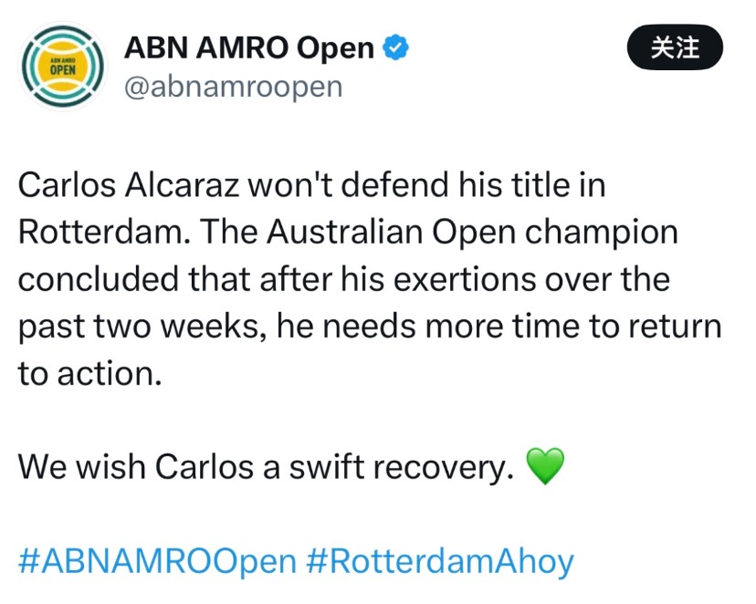 北京时间2月2日晚,ATP500鹿特丹站官方宣布阿尔卡拉斯将缺席本届赛事。今年赛事将于2月9日至15日举行,世界第一正是卫冕冠军,去年阿尔卡拉斯在决赛中击败德米纳尔收获室内赛首冠。