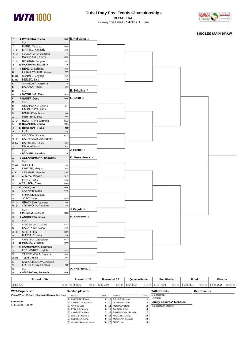 2026WTA迪拜站女单正赛签表