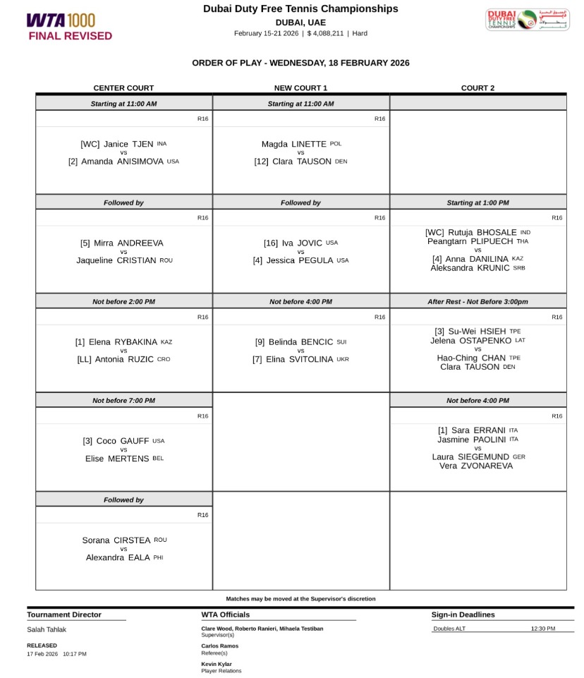 WTA1000迪拜站2月18日赛程