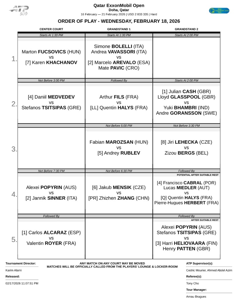 ATP500多哈站2月18日赛程