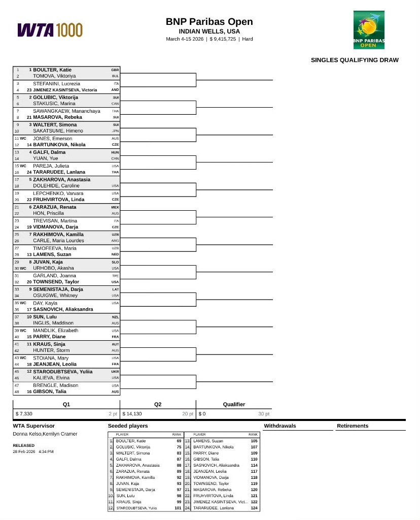 北京时间3月1日上午,2026WTA1000印第安维尔斯站公布女单资格赛签表。近期状态不俗的英国好手博尔特位列头号种子,首轮将战托莫娃,次轮对手将在23号种子卡辛塞娃与斯特凡尼尼之间产生。此外,格鲁比奇、孙璐璐、巴图科娃等球员也入围资格赛签表。