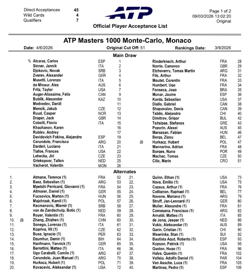 张之臻是唯一报名参赛的中国球员,不过他以保护排名报名后仅位列替补第十位,入围正赛的希望较小。张之臻此前在2024年亮相过蒙特卡洛大师赛,当时他在首轮击败吉隆,成功晋级32强。