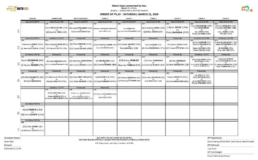 3月21日,郑钦文将于北京时间凌晨1:00在2号球场迎战斯蒂文斯。中心球场方面,佩古拉、辛纳和梅德维德夫将在日场亮相,而高芙与帕克斯的美国德比、兹维列夫与本土外卡选手达姆的对决将点燃夜场。