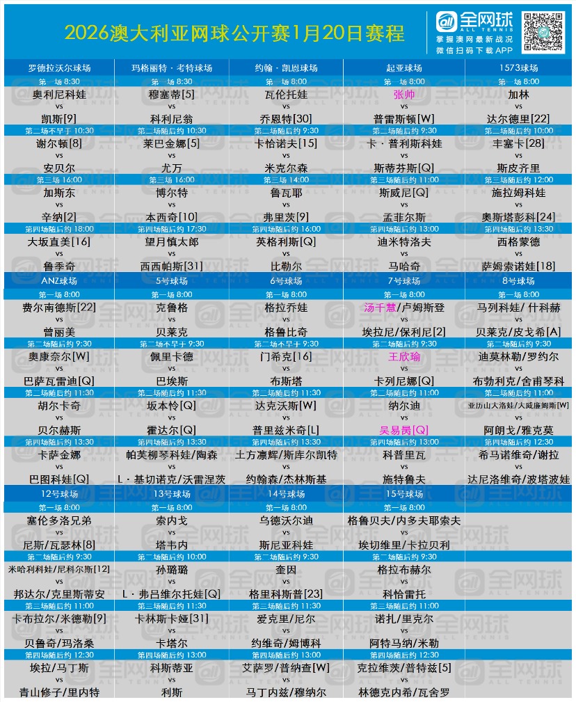 张帅将在起亚球场首场亮相,迎战本土外卡选手普雷斯顿,双方在新赛季首周的布里斯班资格赛刚刚有过一次交手,当时张帅获胜。其余三位中国球员皆安排在7号球场登场,汤千慧与卢姆斯登的组合将挑战2号种子埃拉尼/保利尼,王欣瑜随后在第二场迎战资格赛选手卡列尼娜,吴易昺则在第三场对阵意大利选手纳尔迪。