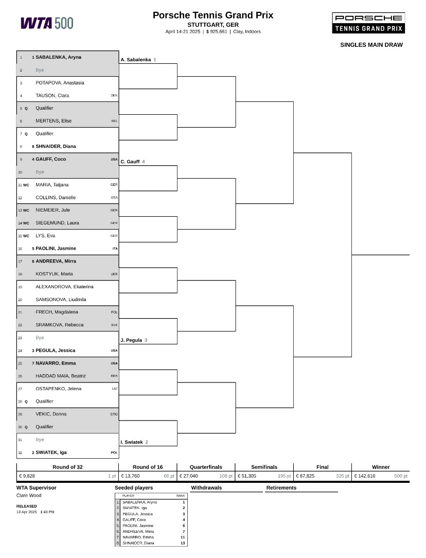WTA斯图加特站正赛将在4月14至21日举行,赛事总奖金为925661美元。女单冠军将收获500个WTA积分和142610美元。卫冕冠军是哈萨克斯坦名将莱巴金娜,当时她以6-2、6-2横扫科斯秋克,斩获赛季第三冠、职业生涯第八冠。但本届赛事,莱巴金娜并未参赛。