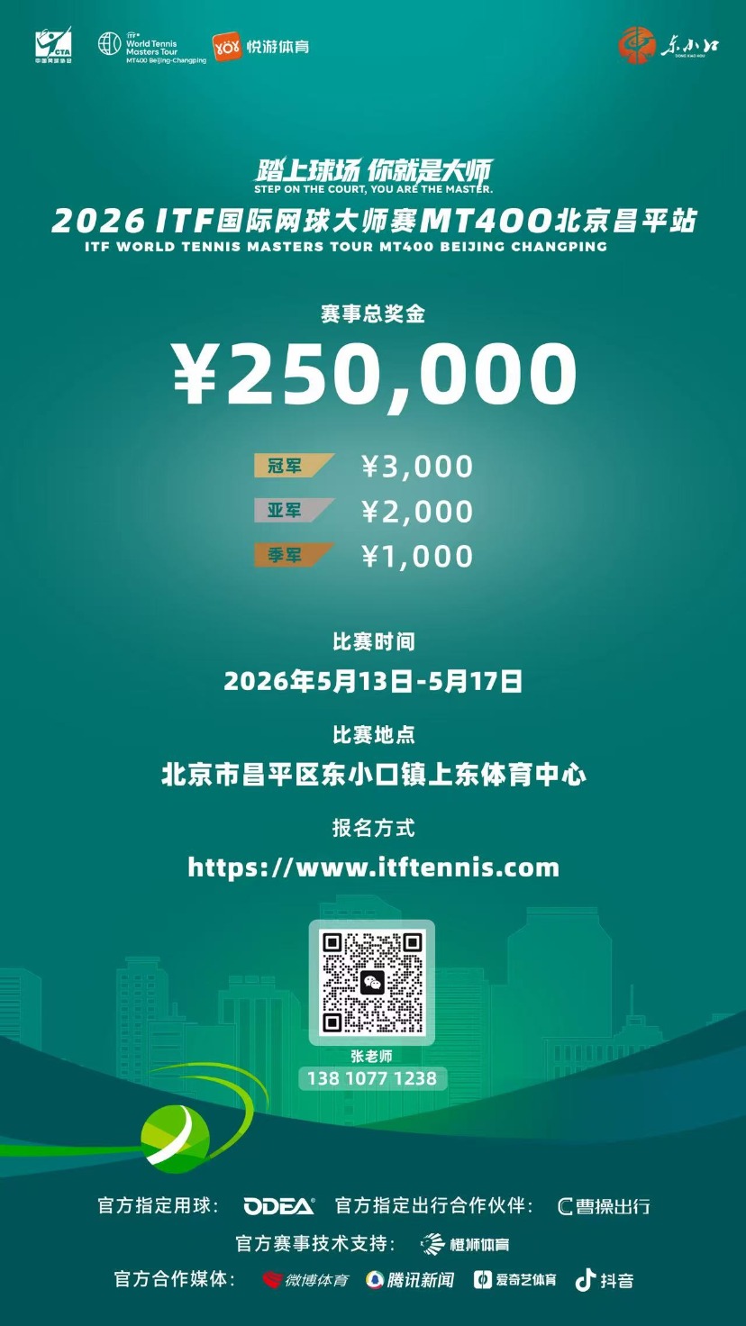 5月13日至17日,2026ITF国际网球大师赛MT400北京昌平站将在昌平区东小口镇上东体育中心举行。一场汇聚全球网球爱好者的顶级赛事即将拉开帷幕,报名通道已正式开启!