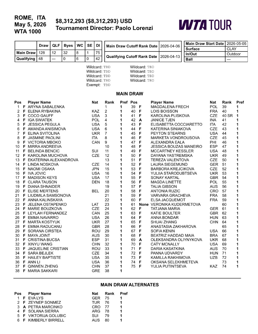 ATP/WTA1000罗马站正赛入围名单本周出炉,作为一项男女1000合赛,罗马站是红土赛季最值得关注的一项大赛。正赛将于5月5日至17日进行,参赛名单星光熠熠,云集男女世界前十。中国军团方面,张之臻、王欣瑜、郑钦文、张帅四人直接入围单打正赛。